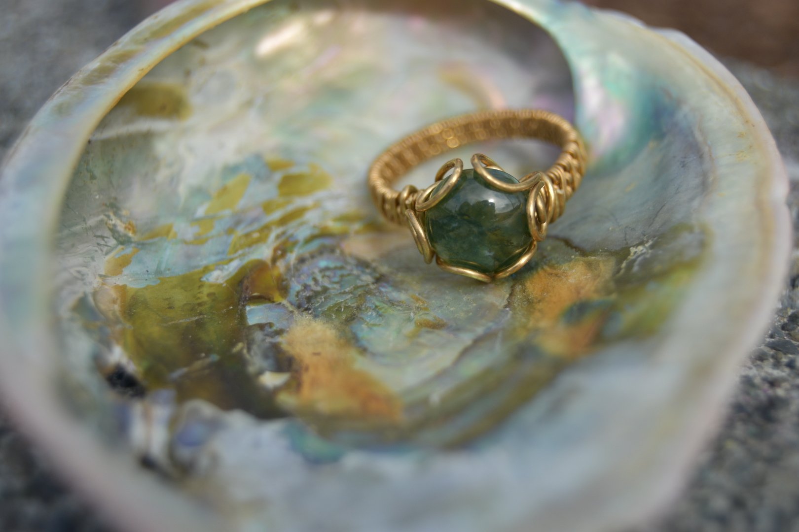 Moss agate held in spirals over a wire weaved band. Moss agate shows its unique patterns in the sun!